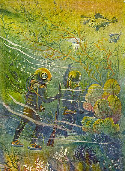 Captain Nemo walked in front, and his companion followed us a few steps to the rear. Conseil and I stayed next to each other, as if daydreaming that through our metal carapaces, a little polite conversation might still be possible! Already I no longer felt the bulkiness of my clothes, footwear, and air tank, nor the weight of the heavy sphere inside which my head was rattling like an almond in its shell. Once immersed in water, all these objects lost a part of their weight equal to the weight of the liquid they displaced, and thanks to this law of physics discovered by Archimedes, I did just fine. I was no longer an inert mass, and I had, comparatively speaking, great freedom of movement.