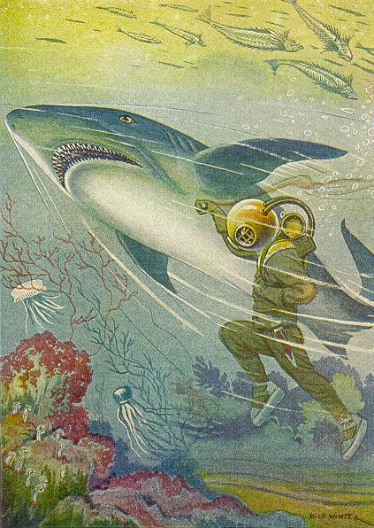I understood his fear. A gigantic shadow appeared above the poor diver. It was a shark of huge size, moving in diagonally, eyes ablaze, jaws wide open!